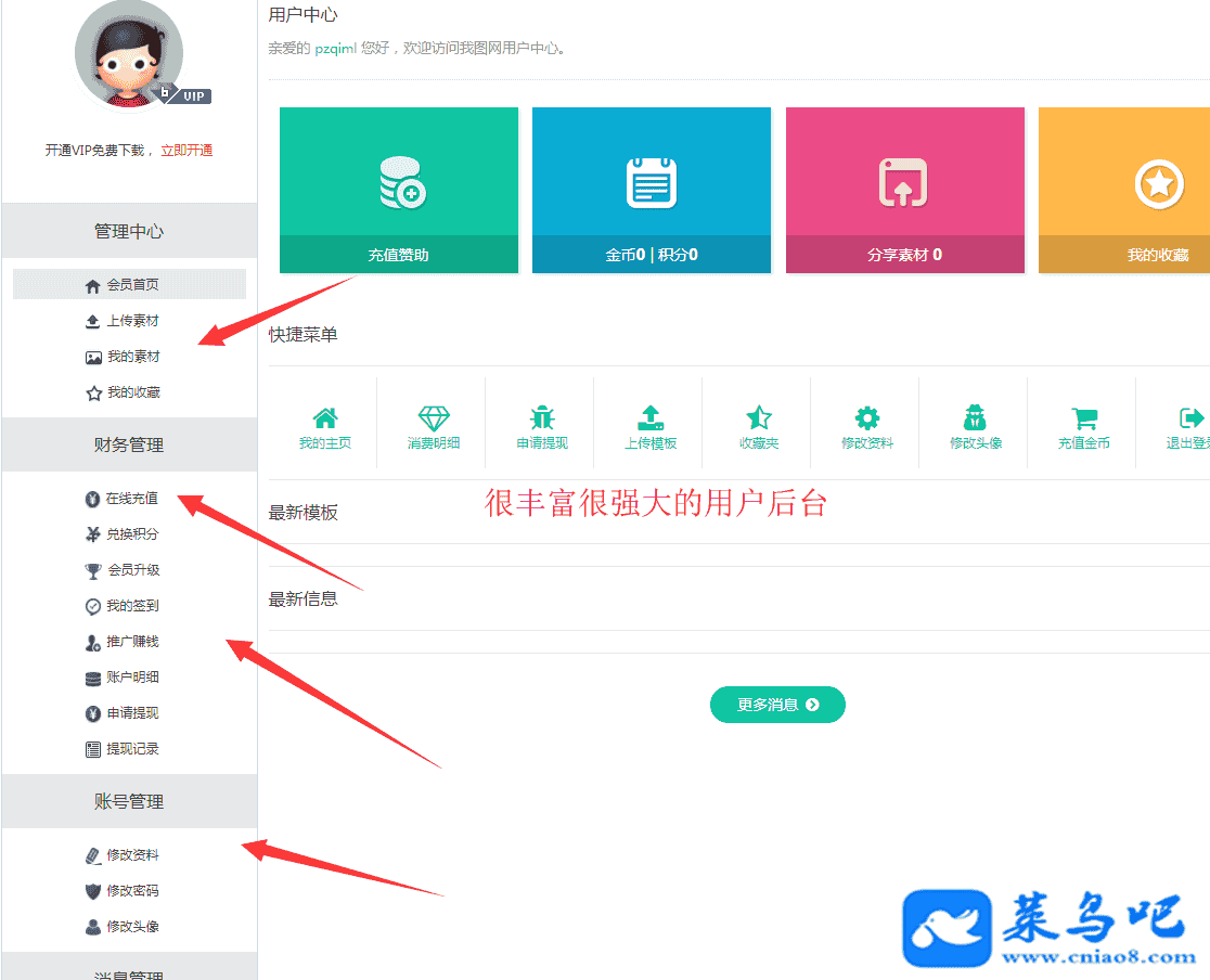 这个模板功能非常强大市场很少见!需要的赶紧加入我们吧!单独购买300元加入菜鸟吧VIP就可以下载源码持续更新!