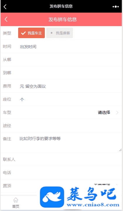 微信拼车源码、发布拼车信息、微信支付、收费置顶、发布信息记录,源码无错可运营,安装需要准备带支付的微信认证服务号【服务号】。