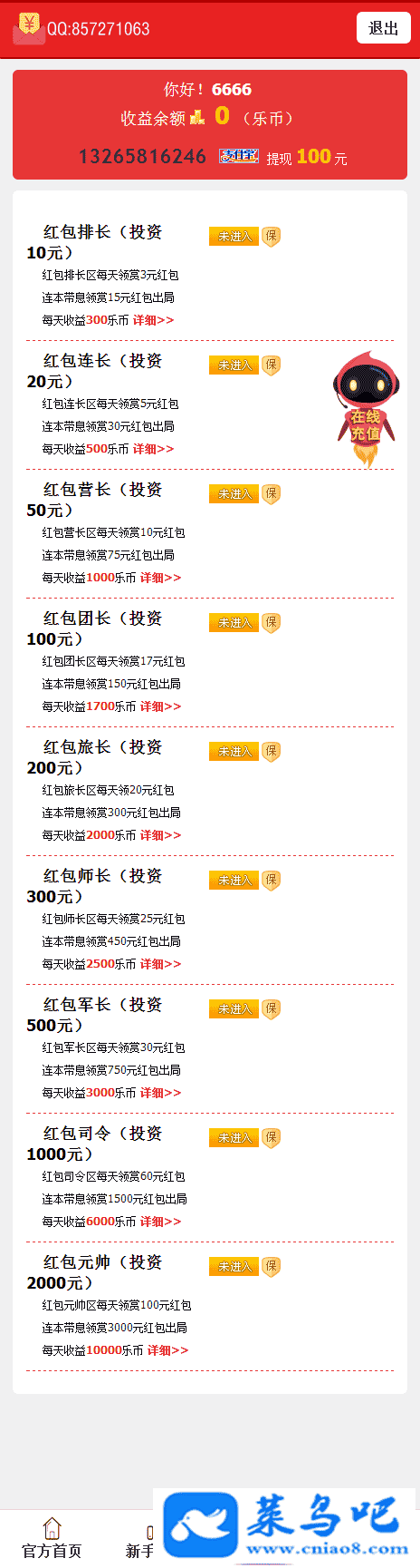 充值10元封赏为红包排长,每天领赏300乐币的红包,5天15元出局充值20元封赏为红包连长,每天领赏500乐币的红包,6天30元出局充值50元封赏为红包营长,每天领赏1000乐币的红包, 8天75元出局充值100元封赏为红包团长,每天领赏1700乐币的红包,9天150元出局充值200元封赏为红包旅长,每天领赏2000乐币的红包,15天300元出局充值300元封赏为红包师长,每天领赏2500乐币的红包,18天450元出局充值500元封赏为红包军长,每天领赏3000乐币的红包,25天750元出局充值1000元封赏为红包司令,每天领赏6000乐币的红包,25天1500元出局充值2000元封赏为红包元帅,每天领赏10000乐币的红包,30天3000元出局出局之后需要复投资才能继续领赏红包。