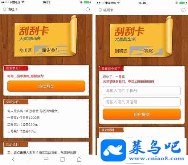 PHP开发的刮刮卡营销系统源码|微信刮刮卡源码是一款基于PHP+MYSQL开发制作的微信会员营销系统!后台自定义设置活动时间,活动名称,活动奖品及中奖管理等信息。用作产品营销非常不错。