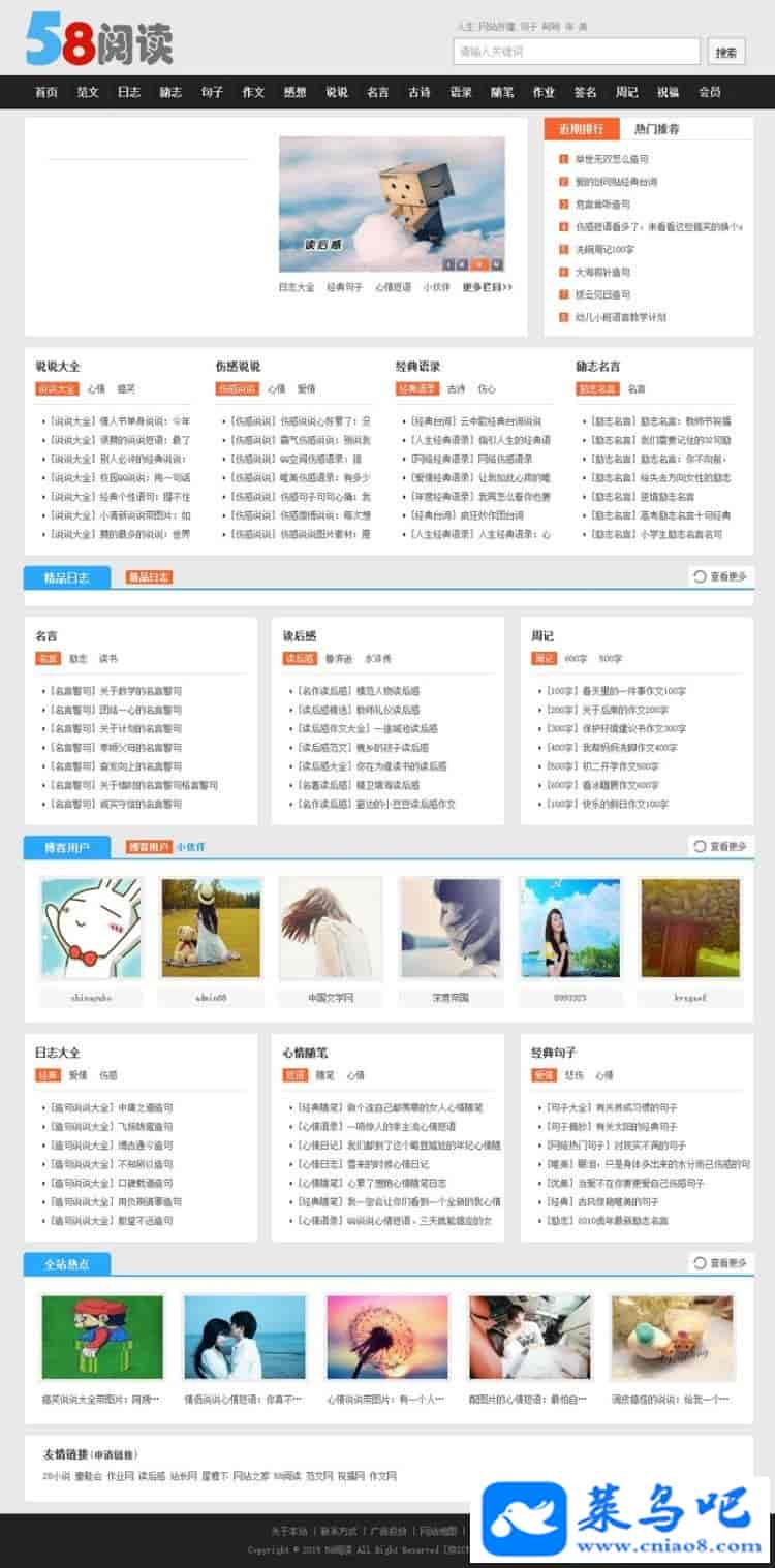 仿 58 阅读帝国 cms 内核新整站源码是一个集范文,美文,散文,诗歌,爱情,日志,心情,人生为主题的阅读欣赏性文学网站,收集一些读后感,心得体会,工作总结等范文大全;伤感文学,情感故事,心情日记等情感日志;经典散文,优美诗歌,精美文章等美文欣赏!
