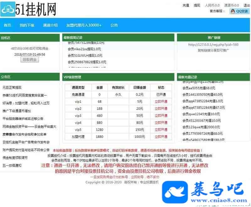 这套源码赚钱原理:让顾客充值开通 VIP,注册会员实际是得不到挂机佣金的(略灰色,仅供学习研究,切勿非法使用)。