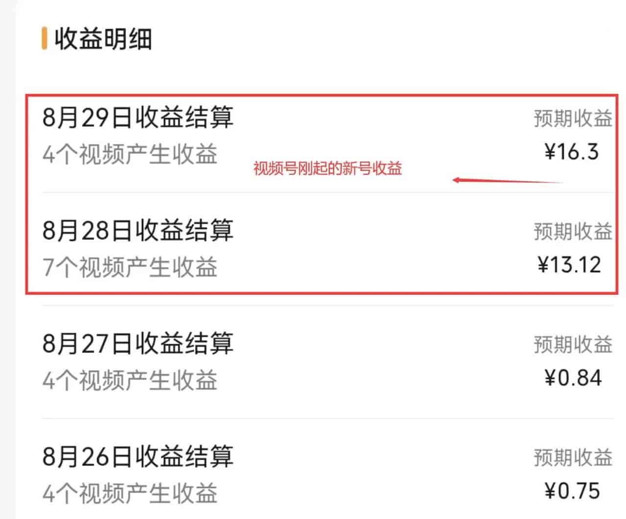 还有新起的账号,当天收益204.65,这个都是一开始就大爆的视频哈!
