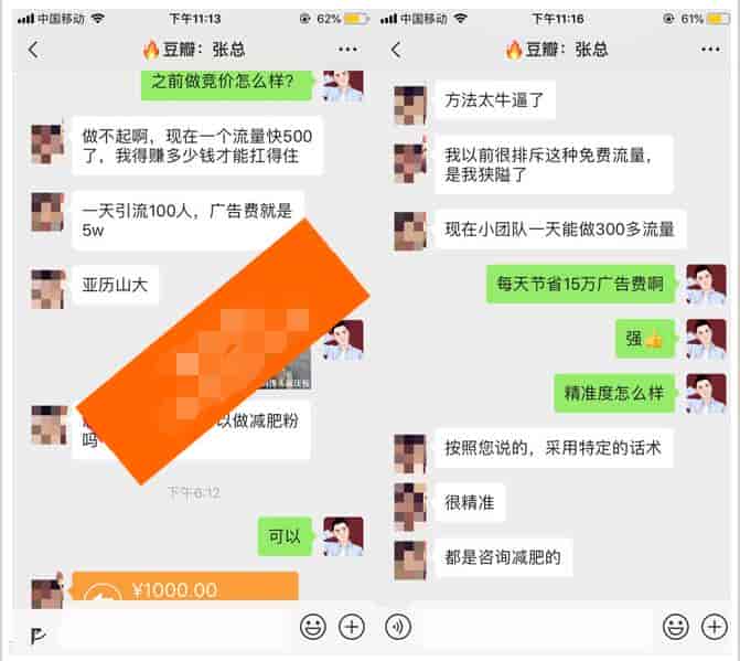 另一个学员老张,在广州当地有自己的工厂,减肥代餐效果过硬,价格也有优势,但是苦于没有客源,付费流量的产出比也不高,后来听朋友介绍了我,团队每天能从豆瓣做300多流量,直接节省15w广告费。