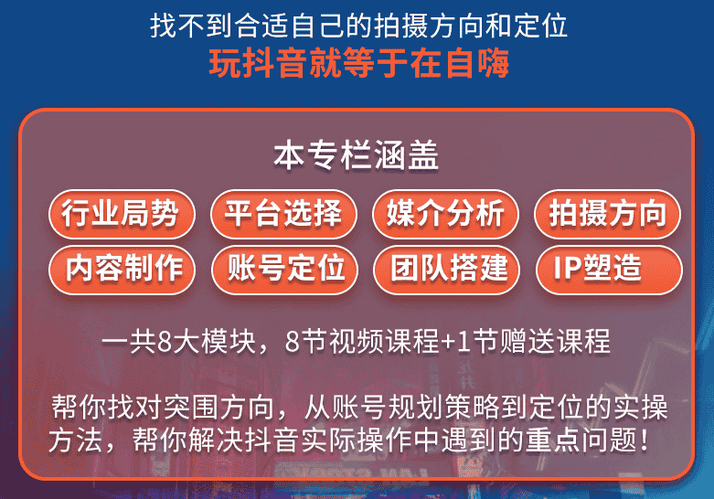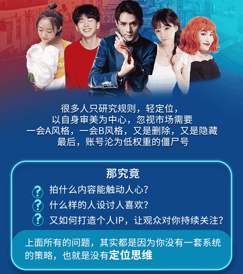 又如何打造个人IP,让观众对你持续关注?上面所有的问题,其实都是因为你没有一套系统的策略,也就是没有定位思维找不到合适自己的拍摄方向和定位玩抖音就等于在自嗨
