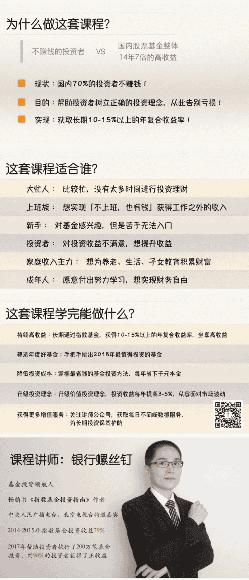 2.[接地气]银行螺丝钉有海量投资案例和丰富的基金投资经验,在2017年帮助投资者执行了200万笔基金投资,约98%的投资者获得了正收益,保证课程贴近投资者的真实需求。