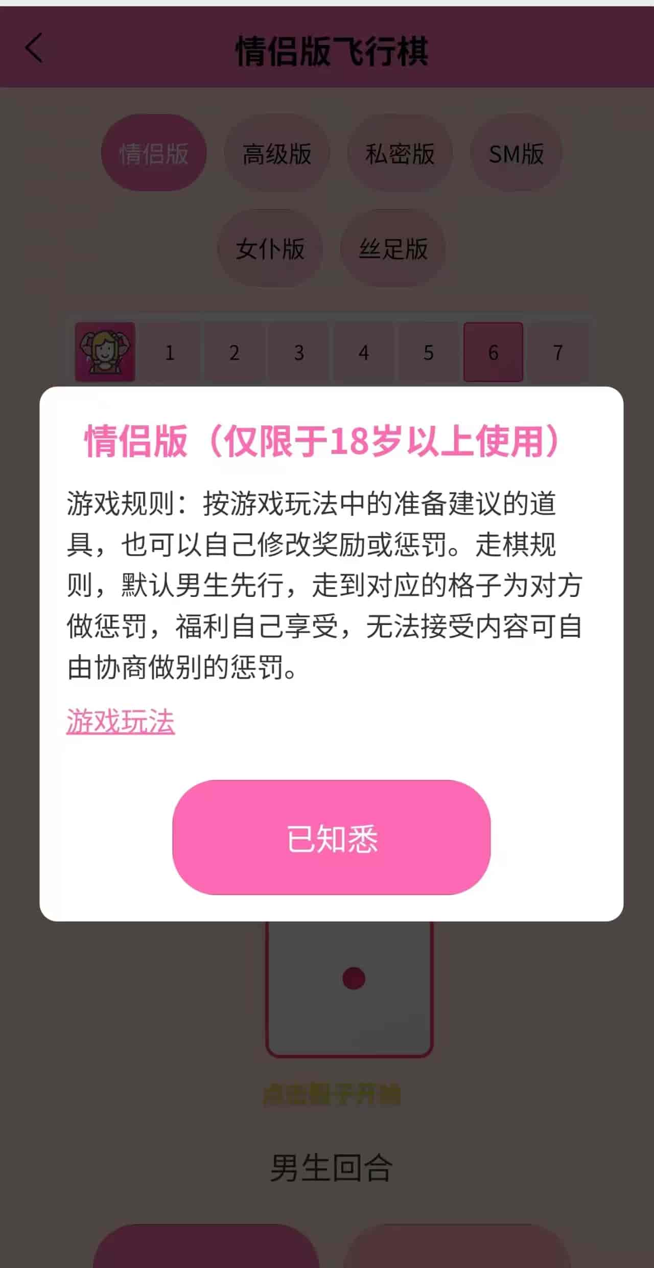 专为情侣设计的飞行棋游戏,多种趣味模式可选,情侣版、高级版、私密版、SM版、女仆版、丝足版都有。男生先行,走到对应格子为对方做惩罚,福利自己享受。仅限18岁以上使用,游戏玩法简单有趣。
