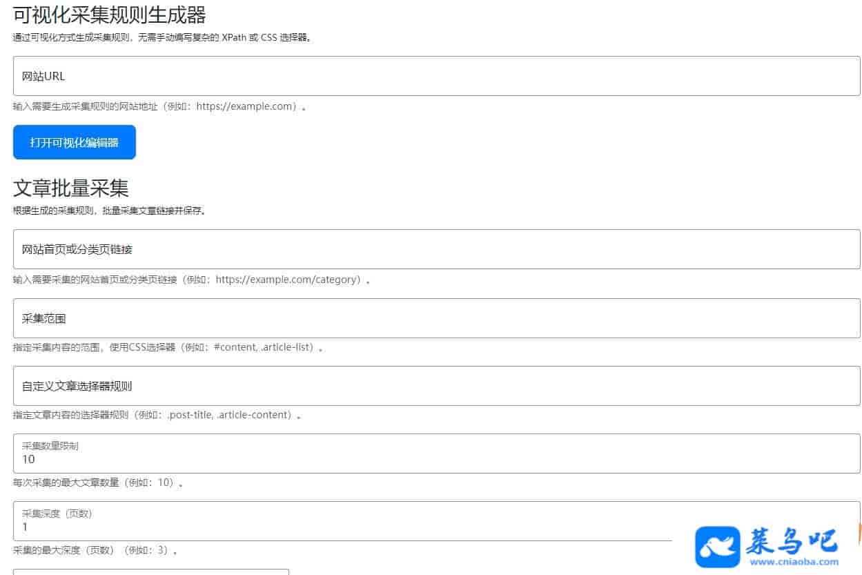 采集指定网站或页面的内容,支持单篇文章和批量采集。提供可视化采集规则生成器,用户可以通过点击操作生成采集规则。支持自定义采集范围和文章选择器规则。