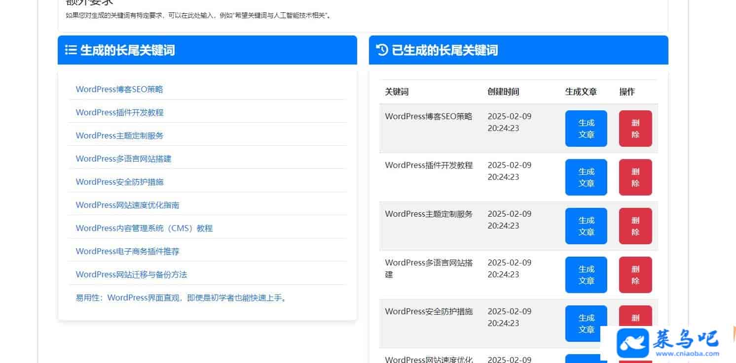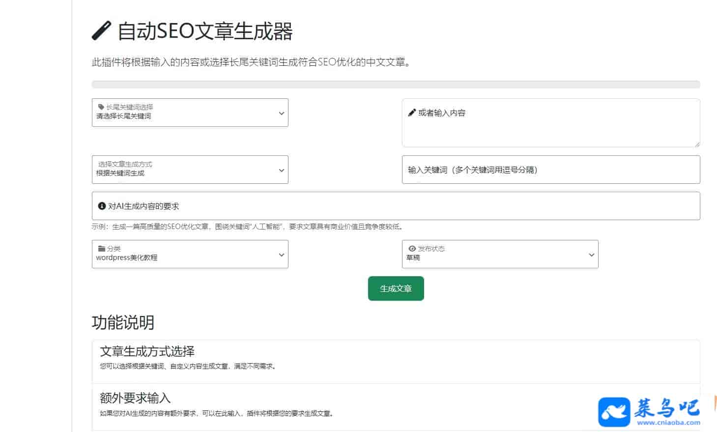 利用 AI 技术自动生成高质量的文章内容。支持根据关键词生成文章,用户可以指定文章长度和额外要求。提供异步生成文章的功能,避免阻塞用户操作。