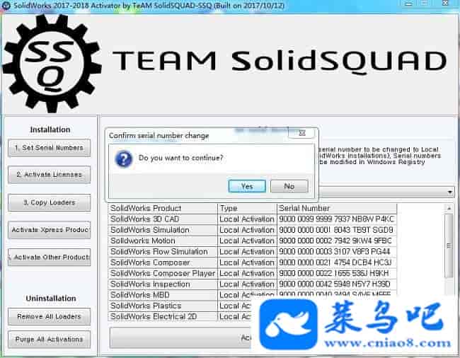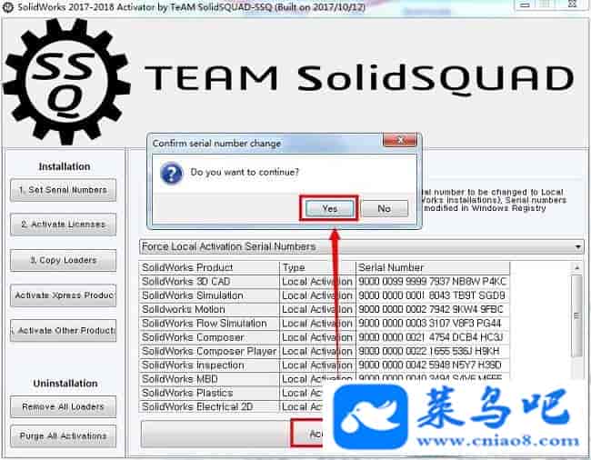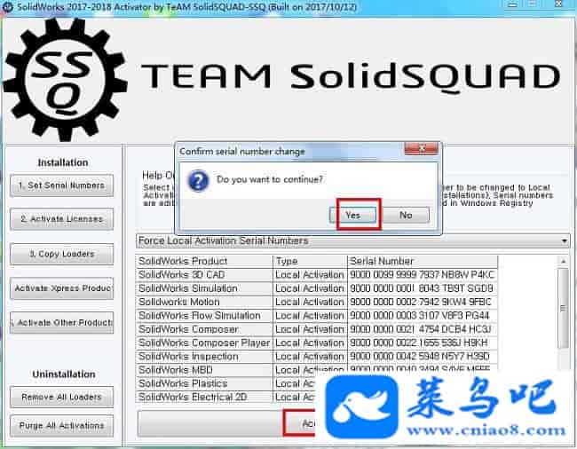 8、然后点击“Accept Serial Numbers”按钮,并在弹出的提示窗口中直接点击“Yes”