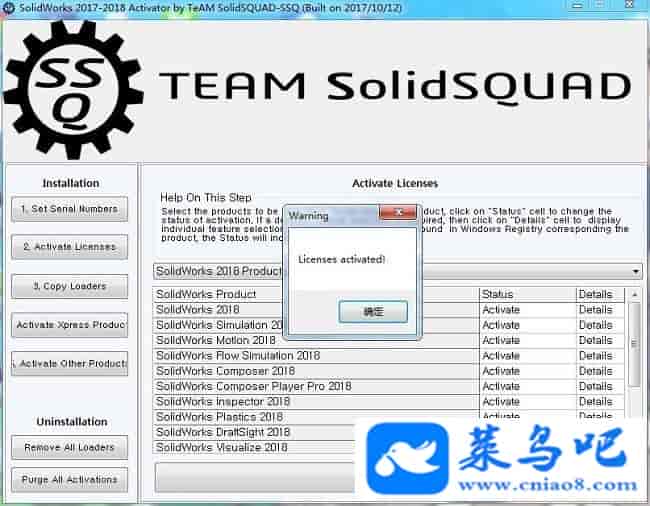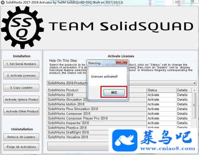 7、再确认所有的Status栏中的属性全部都是Activate之后,再次点击“Activate Licenses”,再次弹出提示框点击Yes