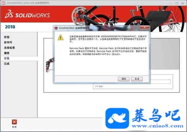 7、开始Solidworks2018程序正式的安装,等待的时间可能过长,请耐心等待,同时在安装的过程中可能会弹出多种提示框,无需多管直接点击确定即可,另外切记在安装的过程中不要去连接网络哦,一旦连接网络就只能重头再来