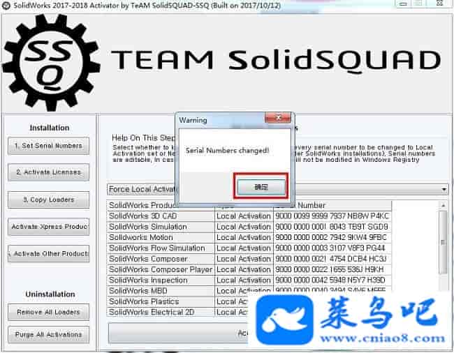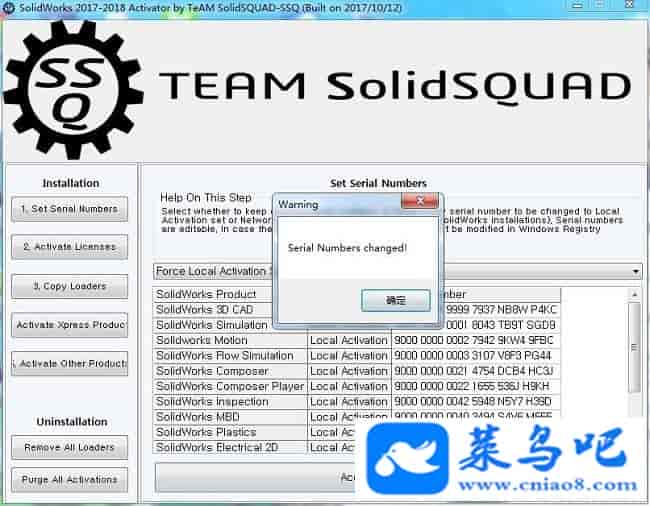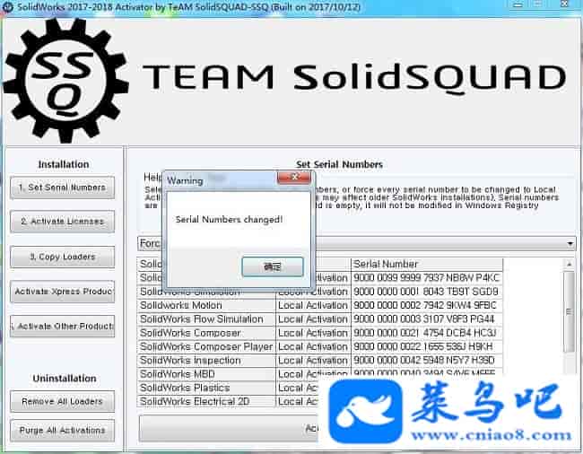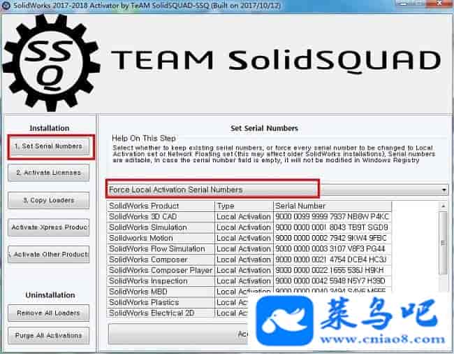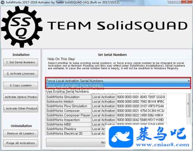 2、运行注册机,点击“1.set serial numbers”将选项修改为“Force Local Activation Serial Numbers”