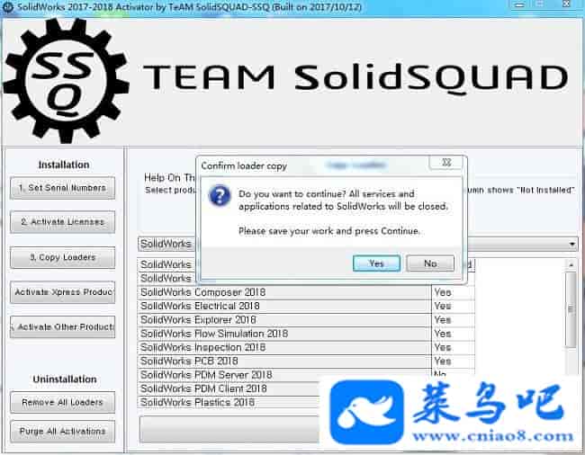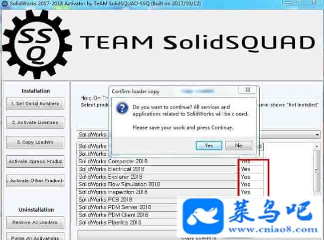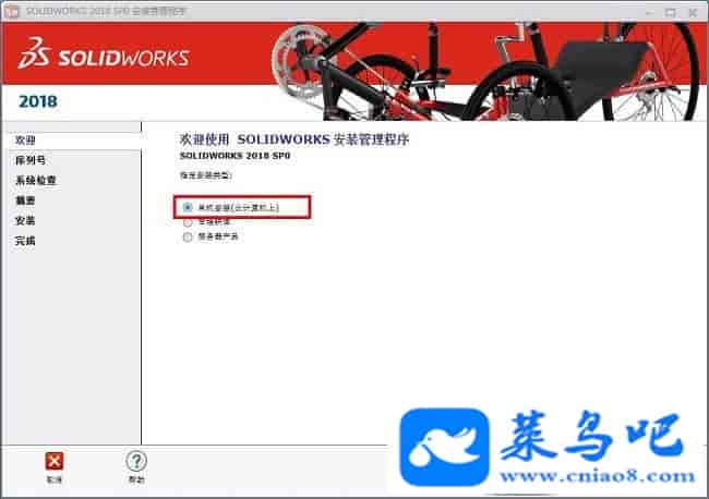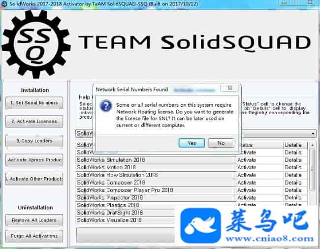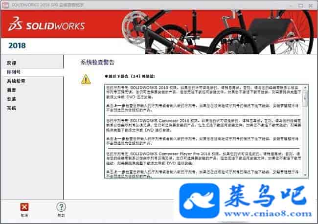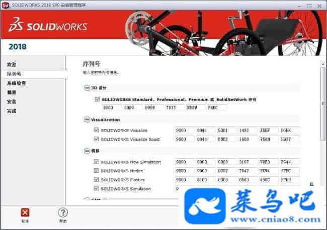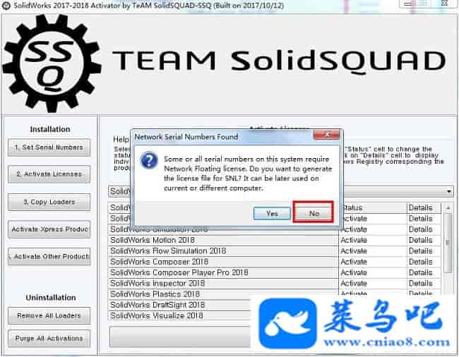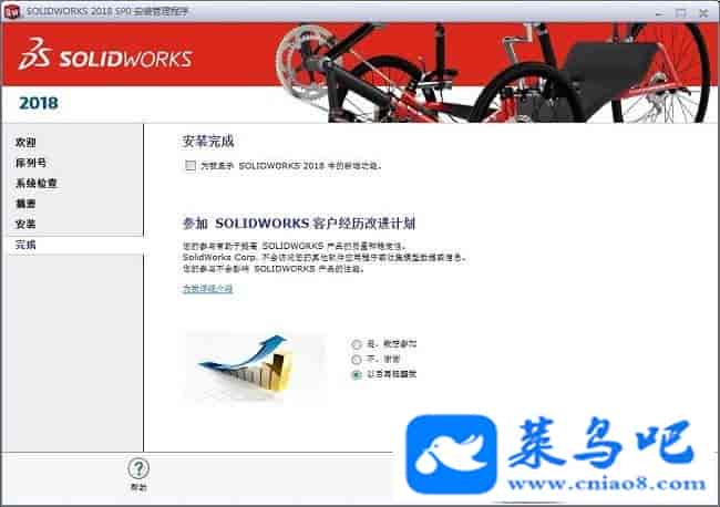 Solidworks2018破解教程PS:以下的教程跟安装前的有些破解教程差不多是一样的,但必须再次重新做一遍,不能直接跳过,同时需注意以下的破解教程可能有些步骤用户并不会遇到,无需担心直接跳过那个步骤即可,只要最后一步的YE变成NO即可