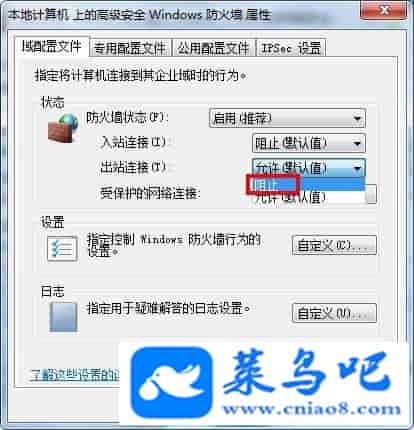 4、进入“域配置文件”页面,找到状态下的“出站连接”并点击“阻止”,然后点击“确定”