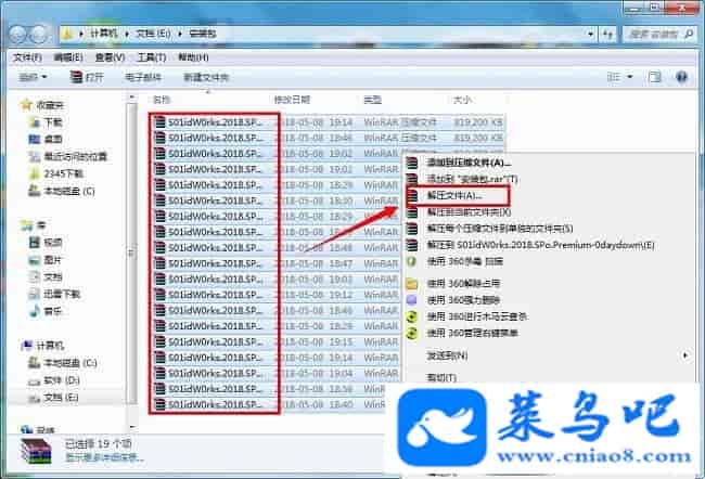 5、之后回到电脑主界面,找到刚才我们下载的19个安装包,然后鼠标右键全选这19个压缩包,记住这19个压缩包一定要全部选择,少一个都会导致安装失败的哦,然后再确认19个都全选之后点击“解压文件”,并等待解压完成