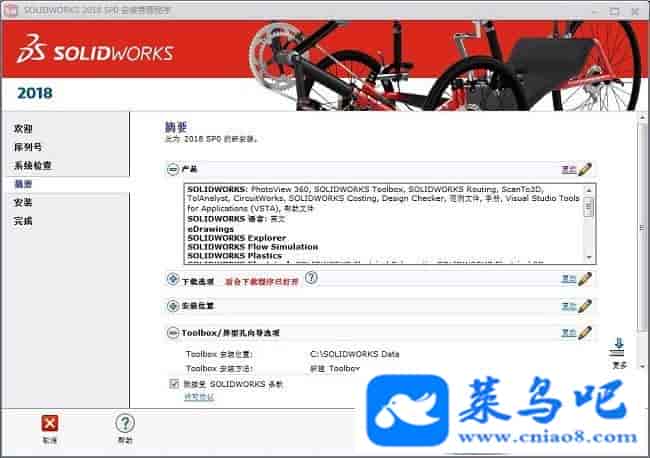 6、进行Solidworks2018安装功能和安装目录等设置,设置完成后勾选“我接受Solidworks条款”,安装路径和功能可自定义,但建议非专业人士不要去随意更改可直接点击“开始安装”