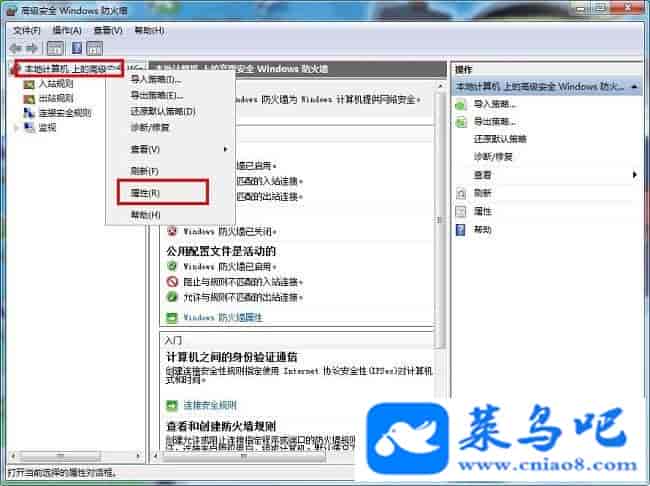 3、打开之后进入“高级设置”界面,鼠标右键点击“本地计算机上的高级安全”,在弹出的窗口中点击“属性”