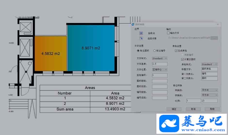 对封闭的区域和对象标注编号或面积,可同时生成面积表格并可以将面积数据输出成文本或表格文件。