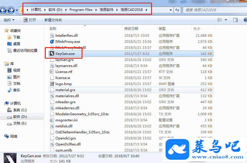 第四步:将破解工具KeyGen.exe放到浩辰CAD 2018软件的安装目录。(小编将软件安装在了D:Program Files浩辰软件浩辰CAD2018)