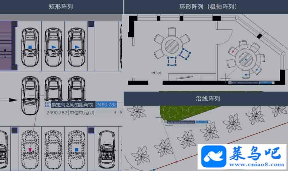 新阵列包括矩形阵列、环形和沿线阵列,可通过面板、属性框、夹点动态调整阵列的相关参数。