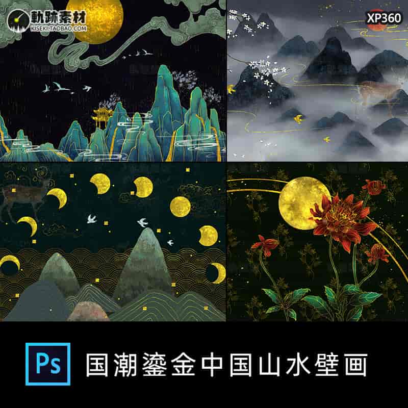 鎏金国潮复古金线烫金中国山水壁画仙鹤仙鹤装饰画设计素材PSD
