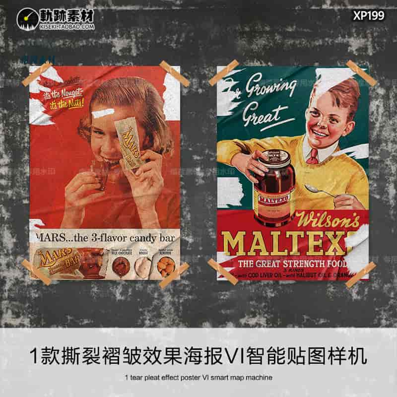 破旧褶皱撕裂效果复古海报PSD智能贴图样机效果图模型设计素材PS