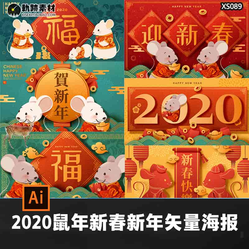 2020鼠年新年贺卡春节喜庆红色卡通剪纸风ai矢量插画海报设计素材