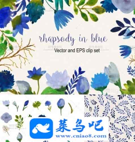 AI向量 蓝色淡雅手绘花朵叶子贺卡请帖卡片背景图案 EPS矢量素材