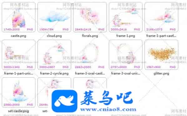 梦幻童话手绘水彩金箔云朵云彩梦幻城堡剪影独角兽PNG免抠素材