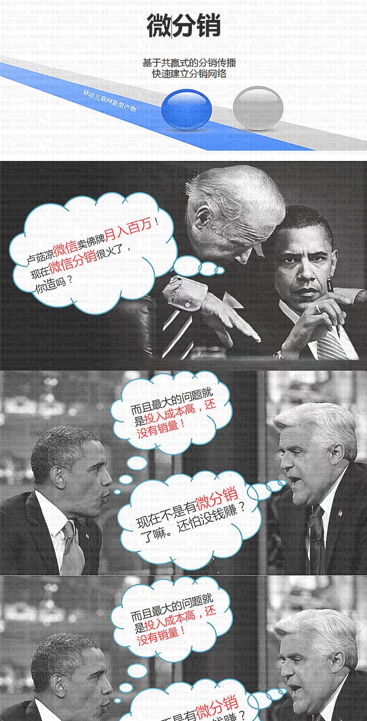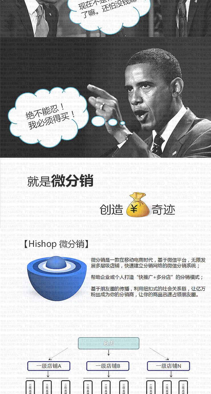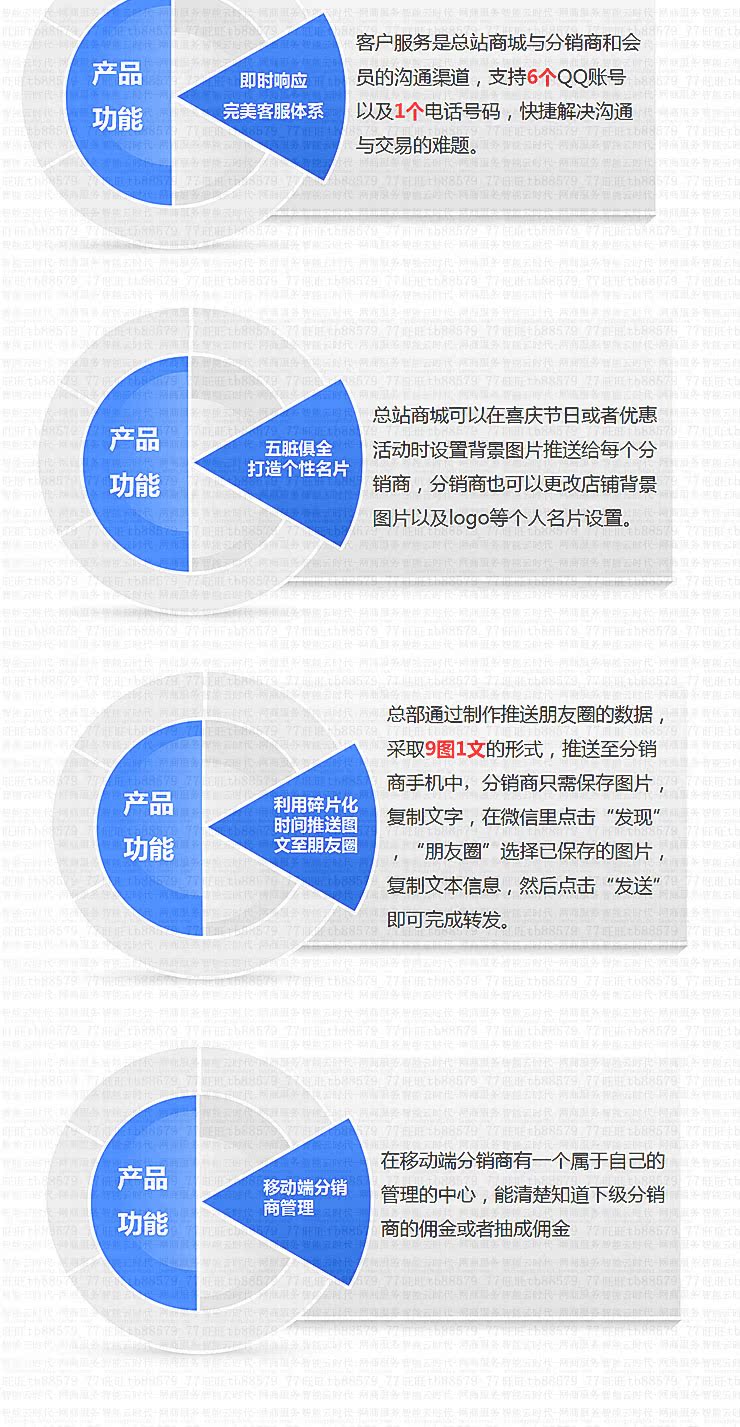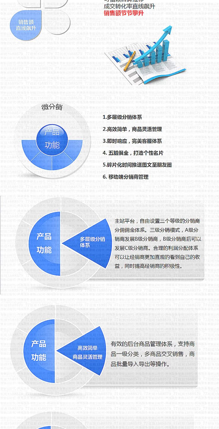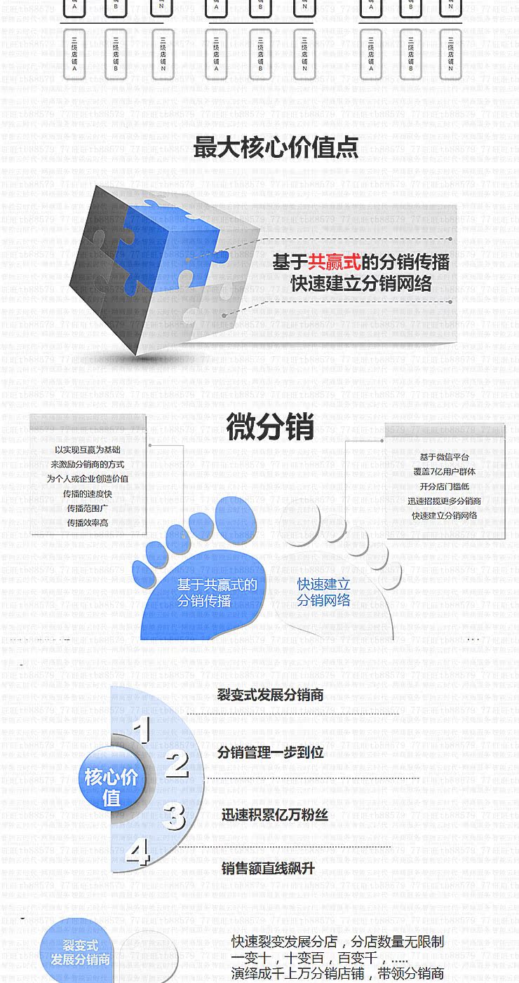 -------------------------------------------------------------------------------------------- 【什么是三级分销】 假如:A发展B,B发展C,C发展D,那么D消费,CBA均可享受提成! 同时:A,B,C,D.会员都可以申请开店,三步快速申请! 比若:B的微店中可以注册会员,那么会员可以继续重复以上两步 【什么是微分销】 微分销是助力企业进军移动电商,完善分销体系搭建微信分销系统。基于微信平台,搭建微信分销商城,让用户享受优质无线购物体验;独创三级分销模式,快速拥有 最广泛的微信分销渠道;零门槛招募优质微商,分销商一键开分店,让亿万粉丝成为你的分销商,让你的商品迅速占领朋友圈! 【微分销能帮你做什么】QQ 1. 国内独创微信三级分销模式,轻松收获微商帮你卖货 主站平台,自由设置三个等级的分销商分佣佣金体系。三级分销模式,每个分销商发展第二级分销商,第二级分销商后可以无限发展第三级分销商。合理的利润分配体系可以让经销商更加直观的看到自己的收益,同时提高经销商的积极性。 2. 玩法自己定,分销商自动来,快速打造微信分销体系卖货 商家拥有的微信商城,给分销商复制千万个分销微店,免除分销商管理商品的困扰,瞬间形成分销体系。 3. 直连微信朋友圈,快速引流收获百分粉丝卖货 通过海量朋友圈,做信赖的口碑营销,让员工、顾客、好友都推荐和销售你的产品,收获朋友圈粉丝帮你卖货。