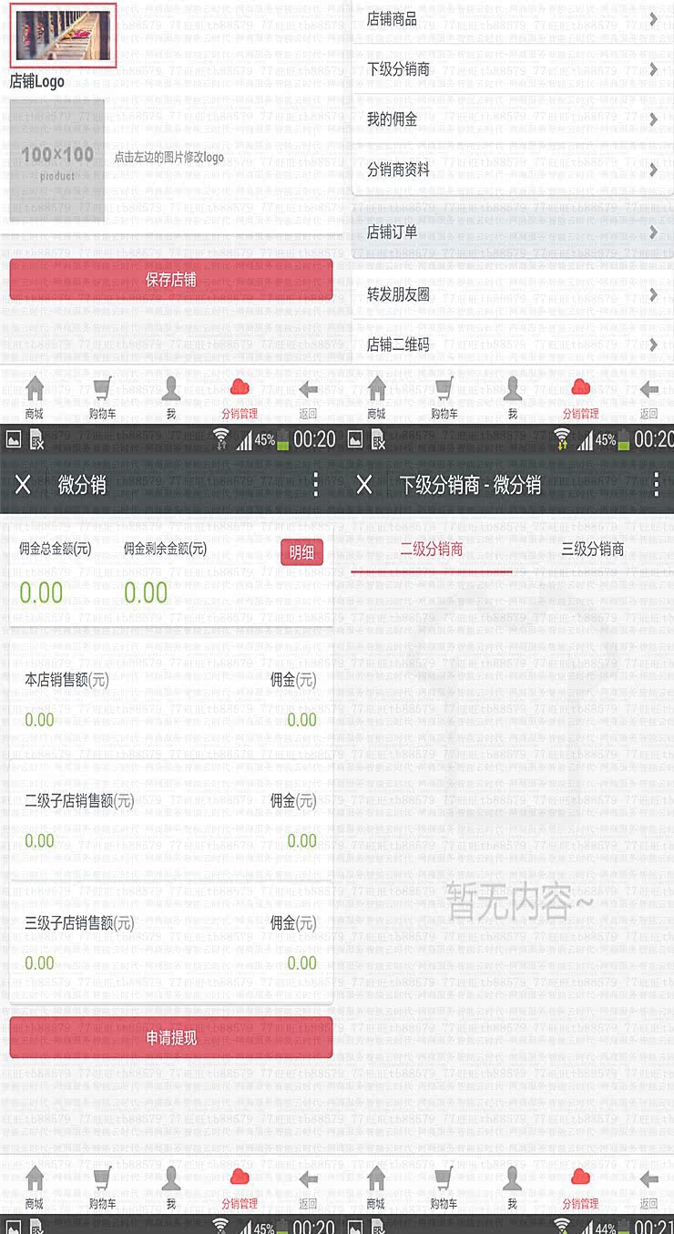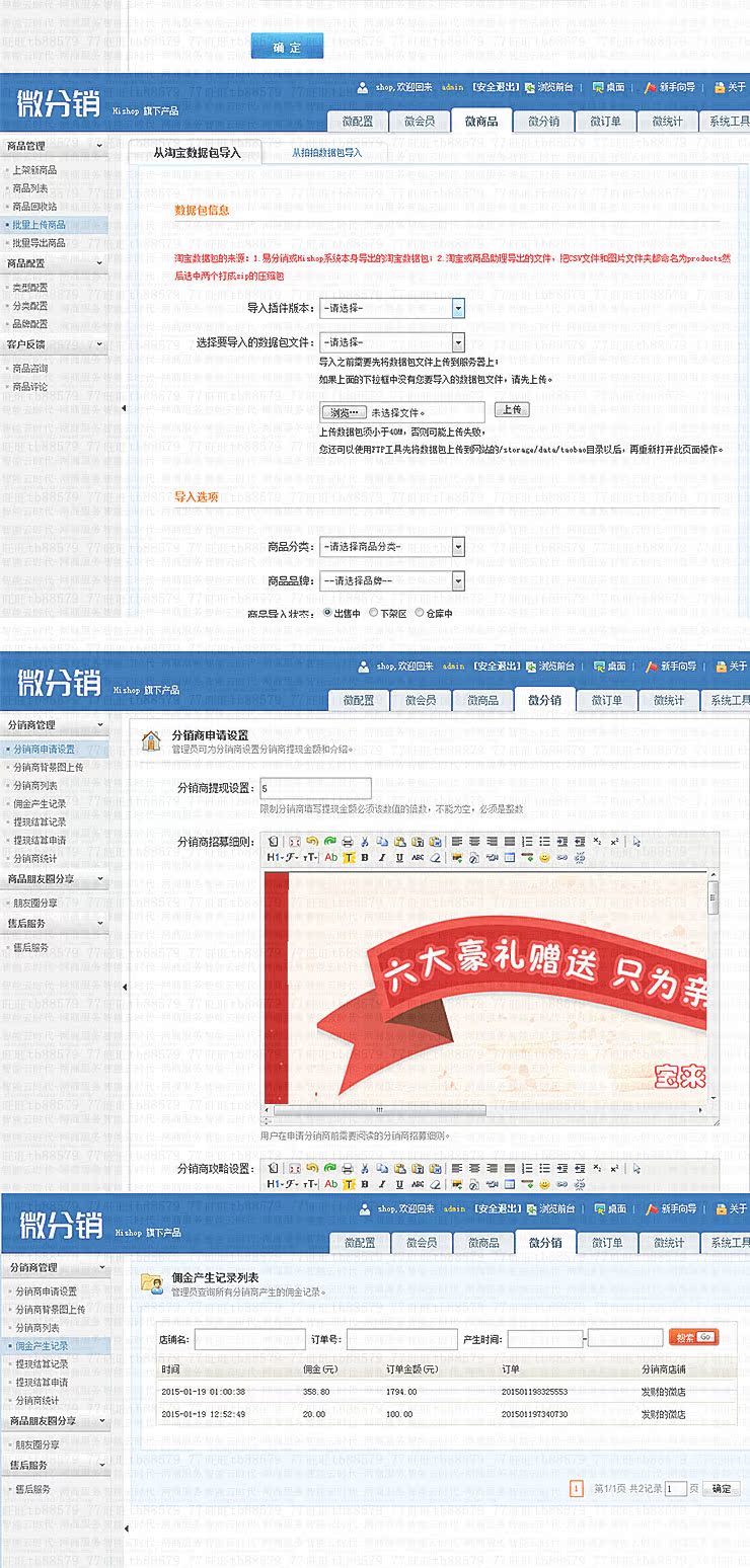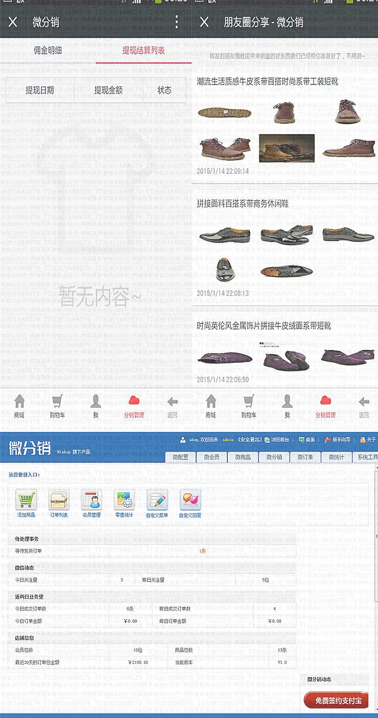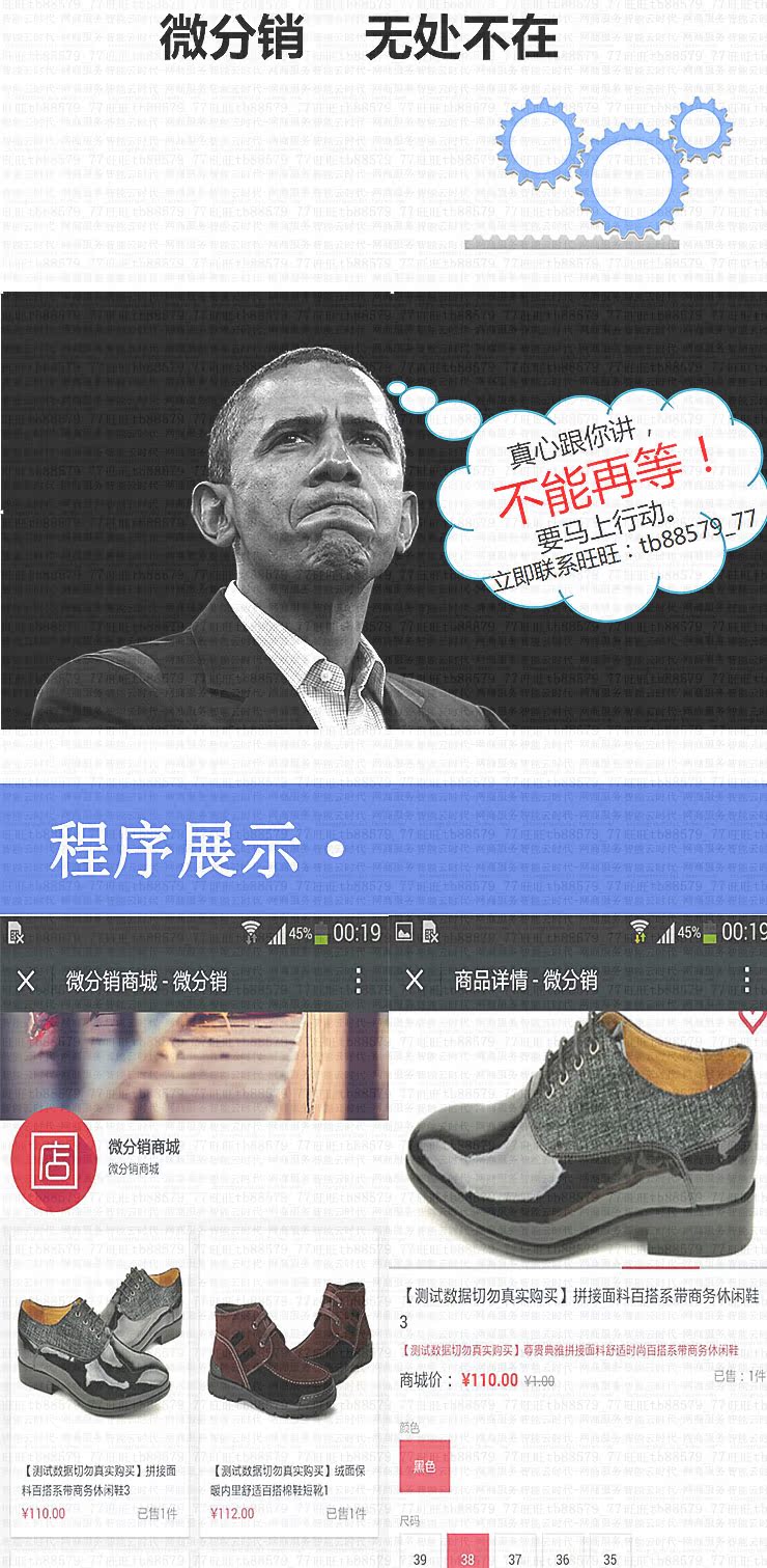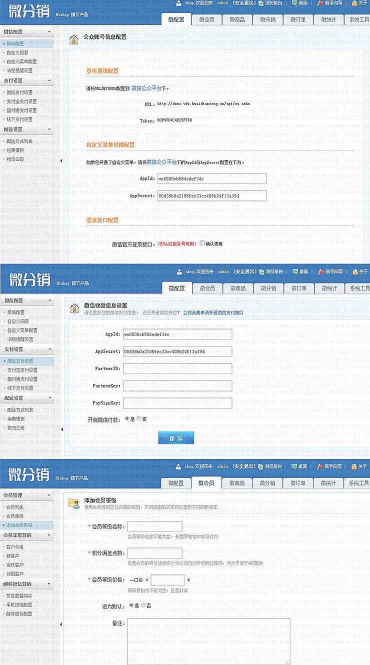 -------------------------------------------------------------------------------------------- 【什么是三级分销】 假如:A发展B,B发展C,C发展D,那么D消费,CBA均可享受提成! 同时:A,B,C,D.会员都可以申请开店,三步快速申请! 比若:B的微店中可以注册会员,那么会员可以继续重复以上两步 【什么是微分销】 微分销是助力企业进军移动电商,完善分销体系搭建微信分销系统。基于微信平台,搭建微信分销商城,让用户享受优质无线购物体验;独创三级分销模式,快速拥有 最广泛的微信分销渠道;零门槛招募优质微商,分销商一键开分店,让亿万粉丝成为你的分销商,让你的商品迅速占领朋友圈! 【微分销能帮你做什么】QQ 1. 国内独创微信三级分销模式,轻松收获微商帮你卖货 主站平台,自由设置三个等级的分销商分佣佣金体系。三级分销模式,每个分销商发展第二级分销商,第二级分销商后可以无限发展第三级分销商。合理的利润分配体系可以让经销商更加直观的看到自己的收益,同时提高经销商的积极性。 2. 玩法自己定,分销商自动来,快速打造微信分销体系卖货 商家拥有的微信商城,给分销商复制千万个分销微店,免除分销商管理商品的困扰,瞬间形成分销体系。 3. 直连微信朋友圈,快速引流收获百分粉丝卖货 通过海量朋友圈,做信赖的口碑营销,让员工、顾客、好友都推荐和销售你的产品,收获朋友圈粉丝帮你卖货。